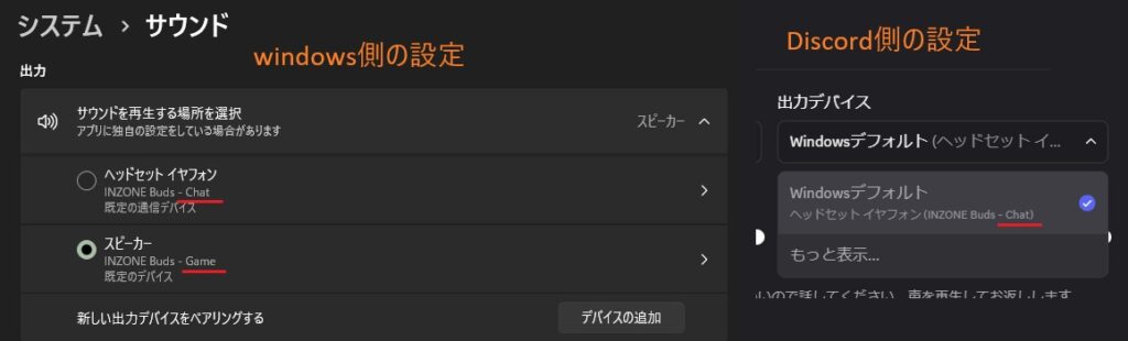 Windows側の出力デバイスを「INZONE Buds game」に、Discord側の出力デバイスを「INZONE Buds chat」に設定してあげる必要があります。