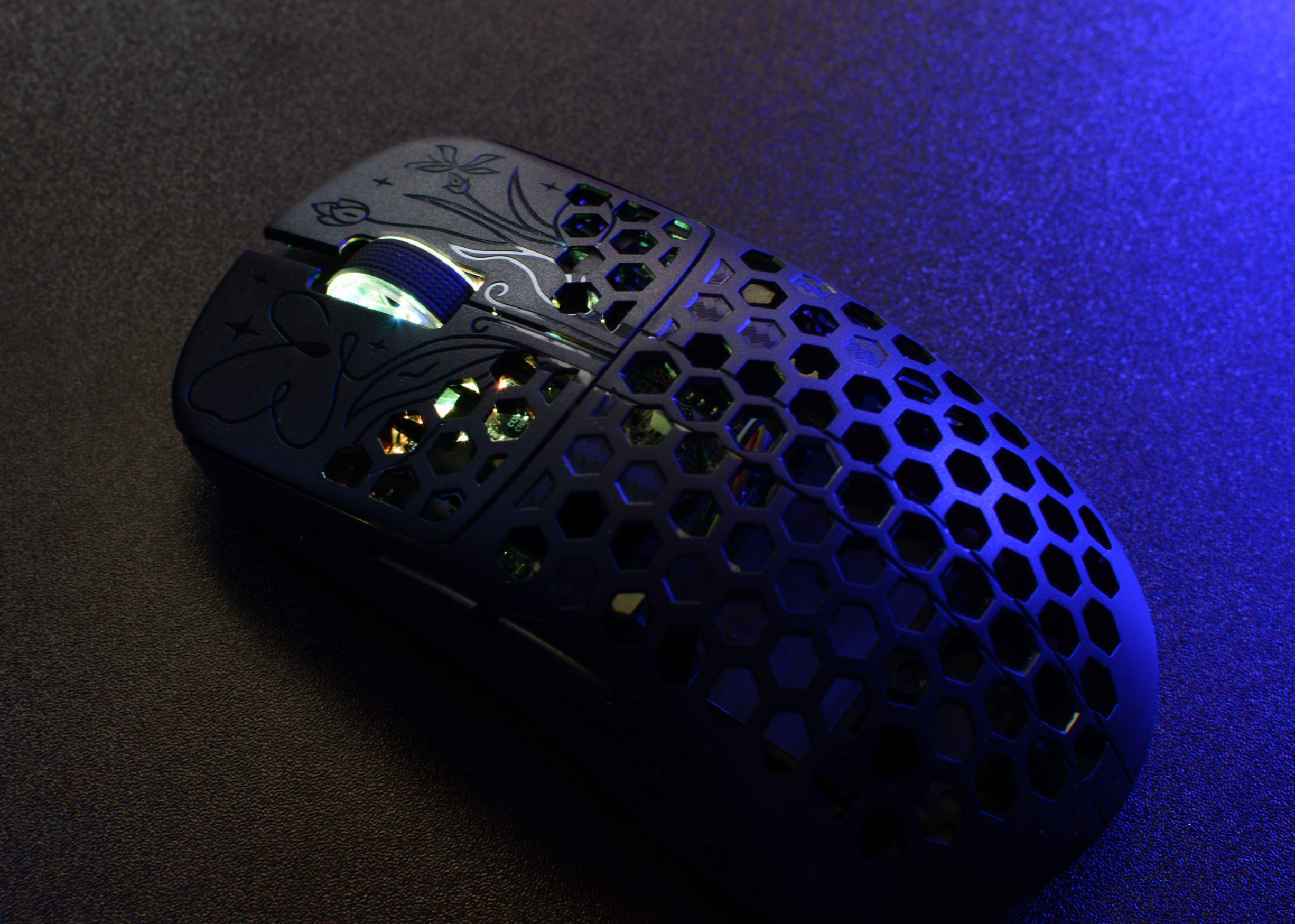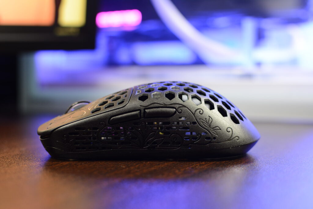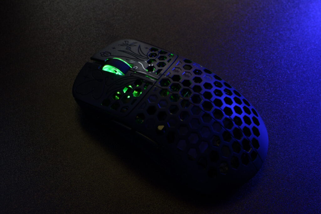 さらに、所々に綾織カーボンの模様を配している点、ホイール部分の美しさや、軽量マウスにも関わらず見栄えのためのLEDを搭載している点など、機能性と見た目、どちらも妥協しない姿勢を感じます。