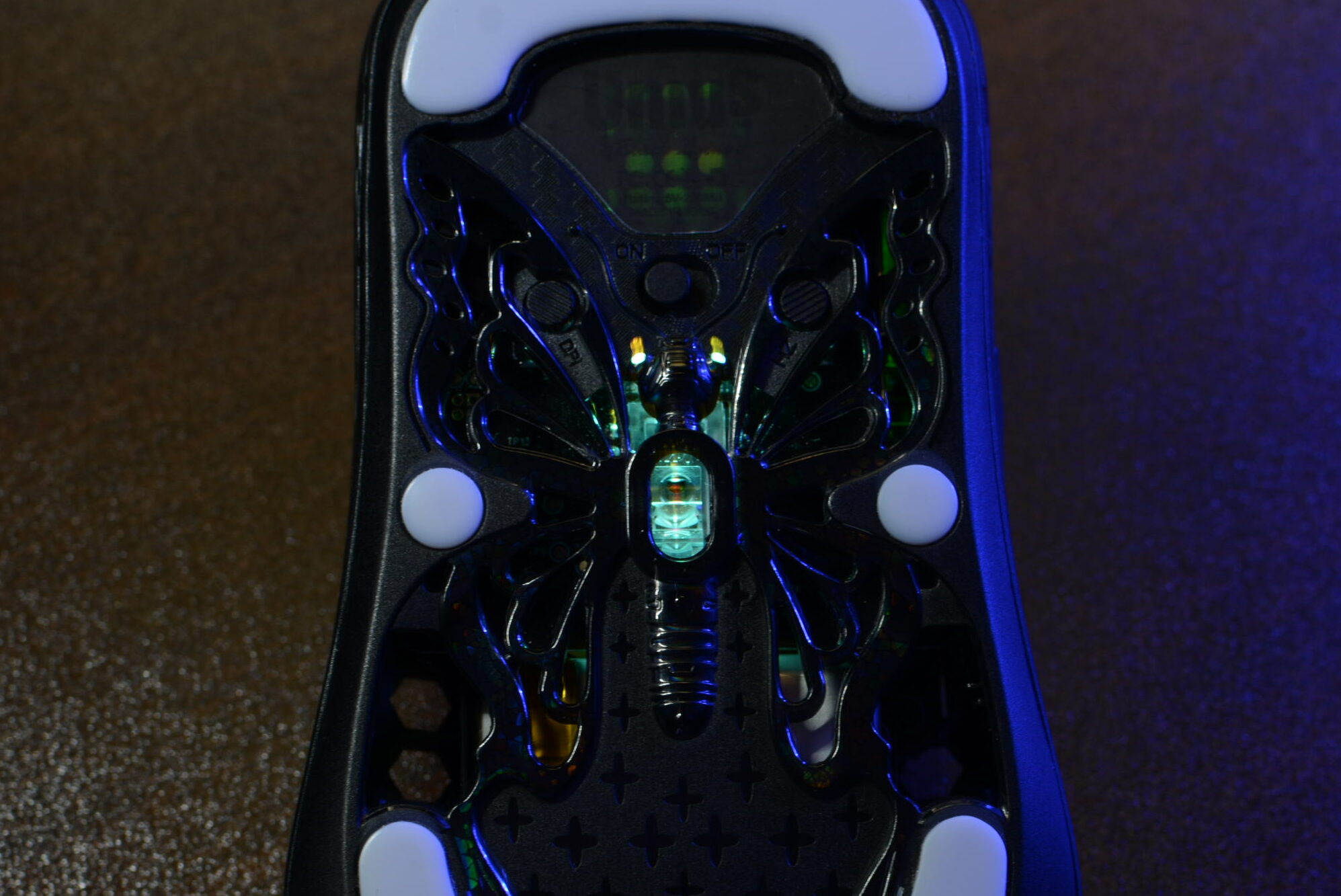 ボタンを押すと後述する蝶の目の部分が任意の色で光ります。