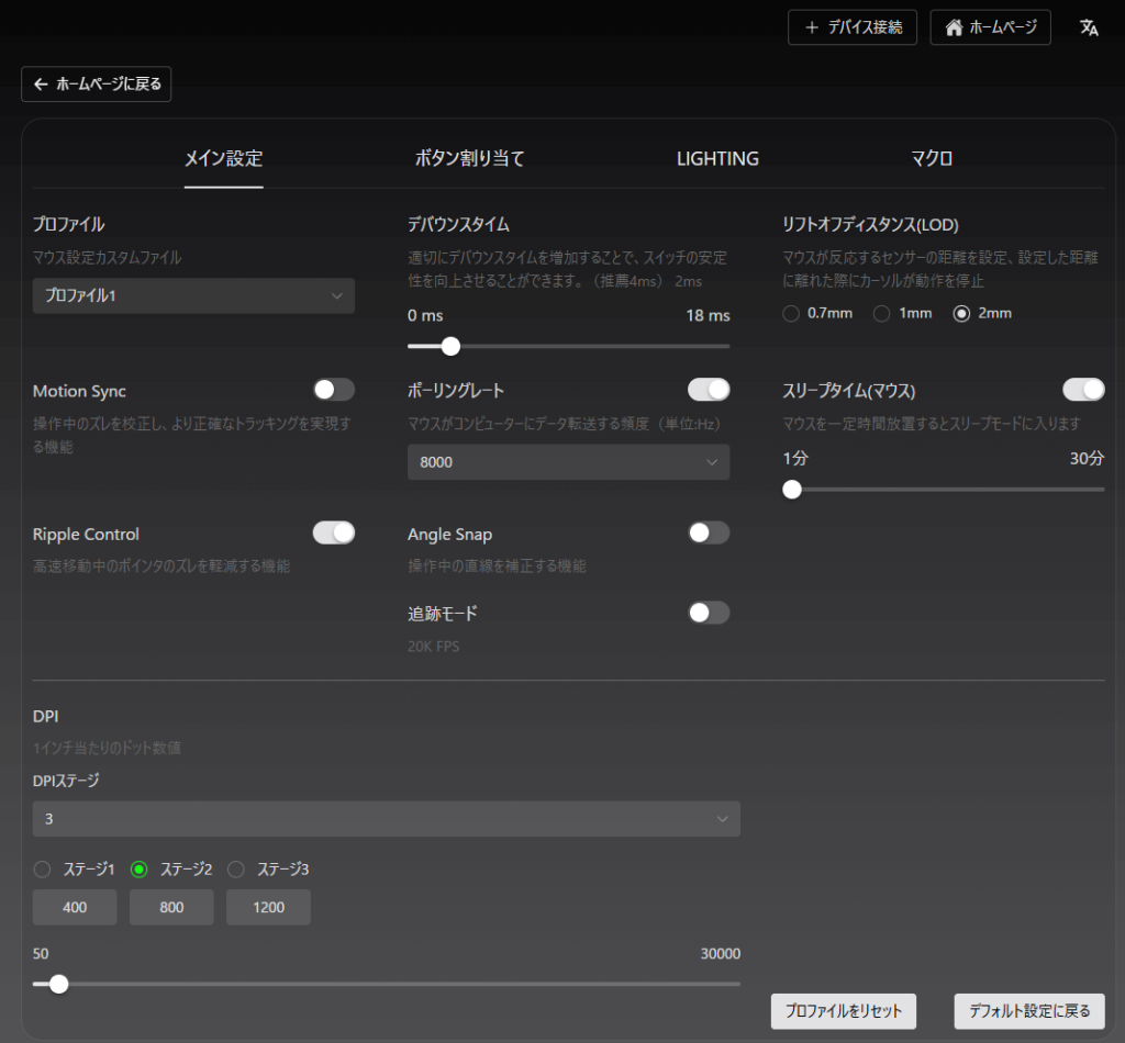 マウスの各種設定はWEBドライバで行います。
